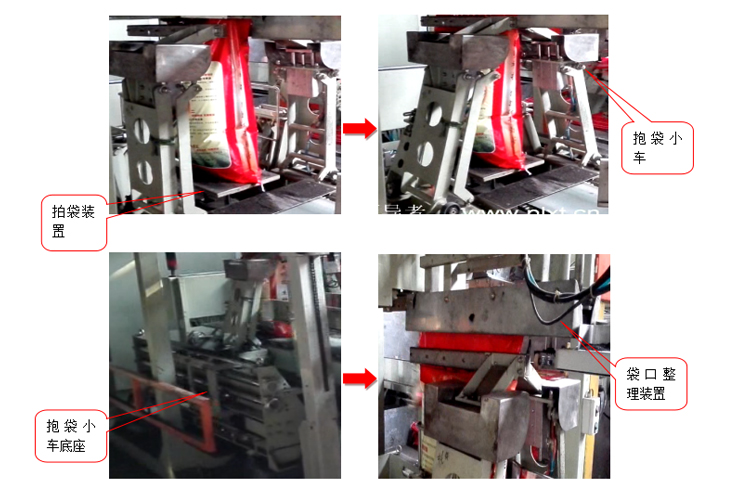 上袋裝置中開(kāi)袋吸盤從包裝袋口上下兩個(gè)方向同時(shí)將包裝袋口吸開(kāi),上袋機(jī)械手伸入袋口內(nèi),將袋的上下兩面同時(shí)夾住,彎曲機(jī)械臂將包裝袋套到定量包裝秤下料口,過(guò)程結(jié)束。